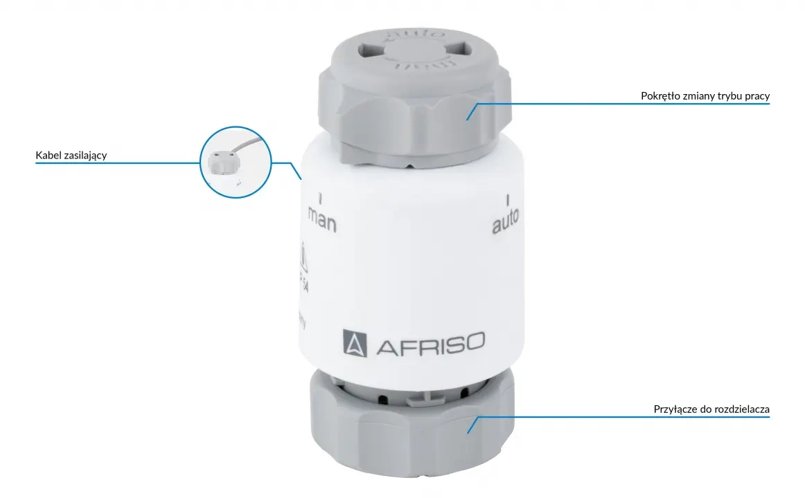 - Pokrętło pozwala na pracę siłownika w trybie ręcznym (siłownik jest stale otwarty) albo automatycznym (praca zgodnie z sygnałem z termostatu/listwy).