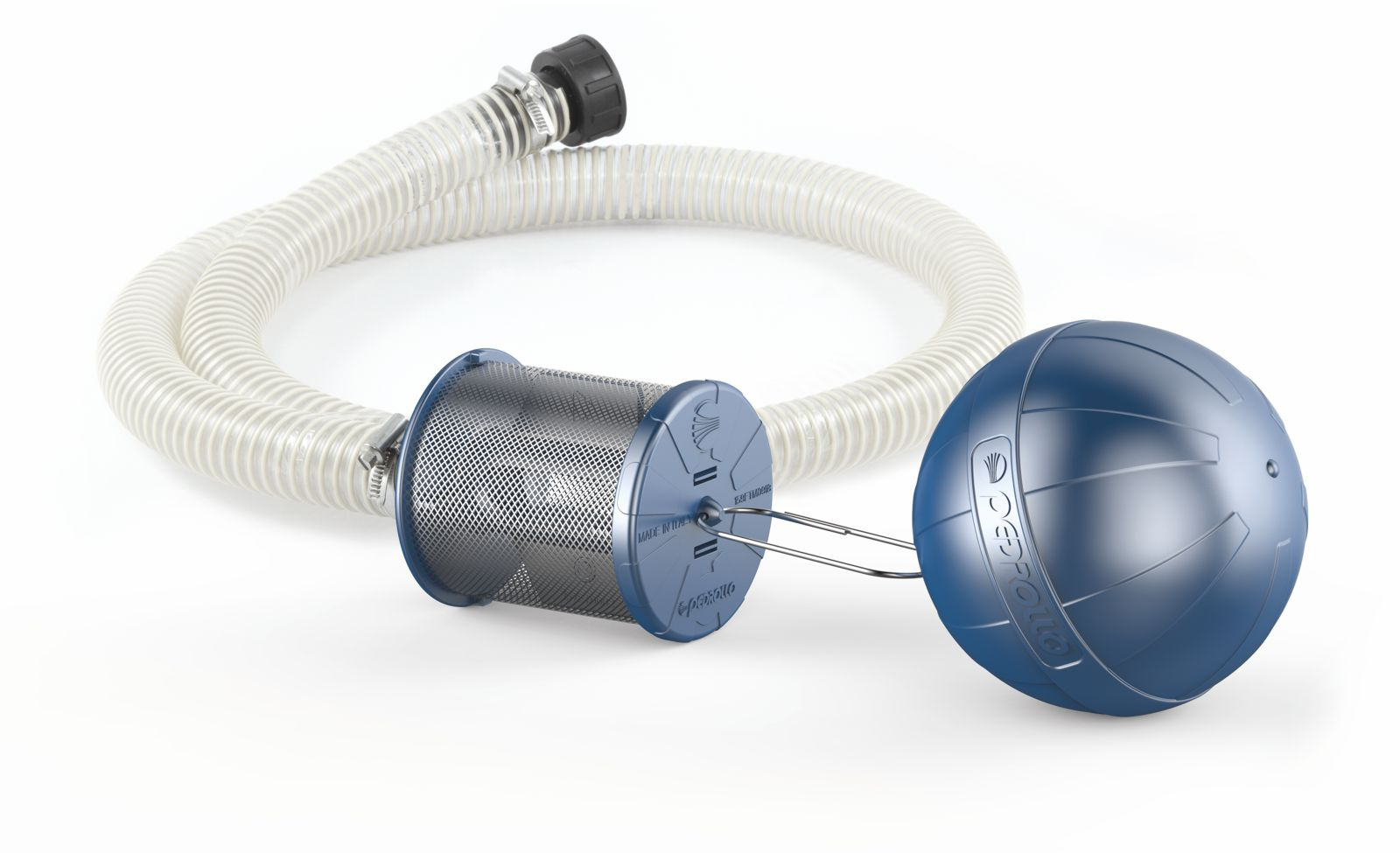 Zestaw ssawny pływający KGE zawiera: wąż PVC (O 30 mm) o długości 1,5 m, filtr ssący ze stali nierdzewnej, pływak kulisty z polietylenu, złączki elastyczne do węża O 30 mm.