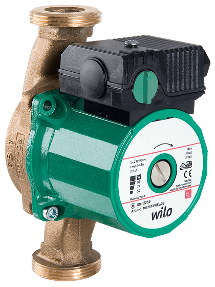 Pompa cyrkulacyjna Wilo-STAR-Z 20/4-3, stałoborowa, 3-biegowa, dł. mont. 150 mm, do 18°dH twardości wody, konstrukcja zapewnia bezszelestną pracę oraz zapobiega osadzaniu się w pompie kamienia kotłowego. Pompa nie wymaga obsługi.Parametry techniczne