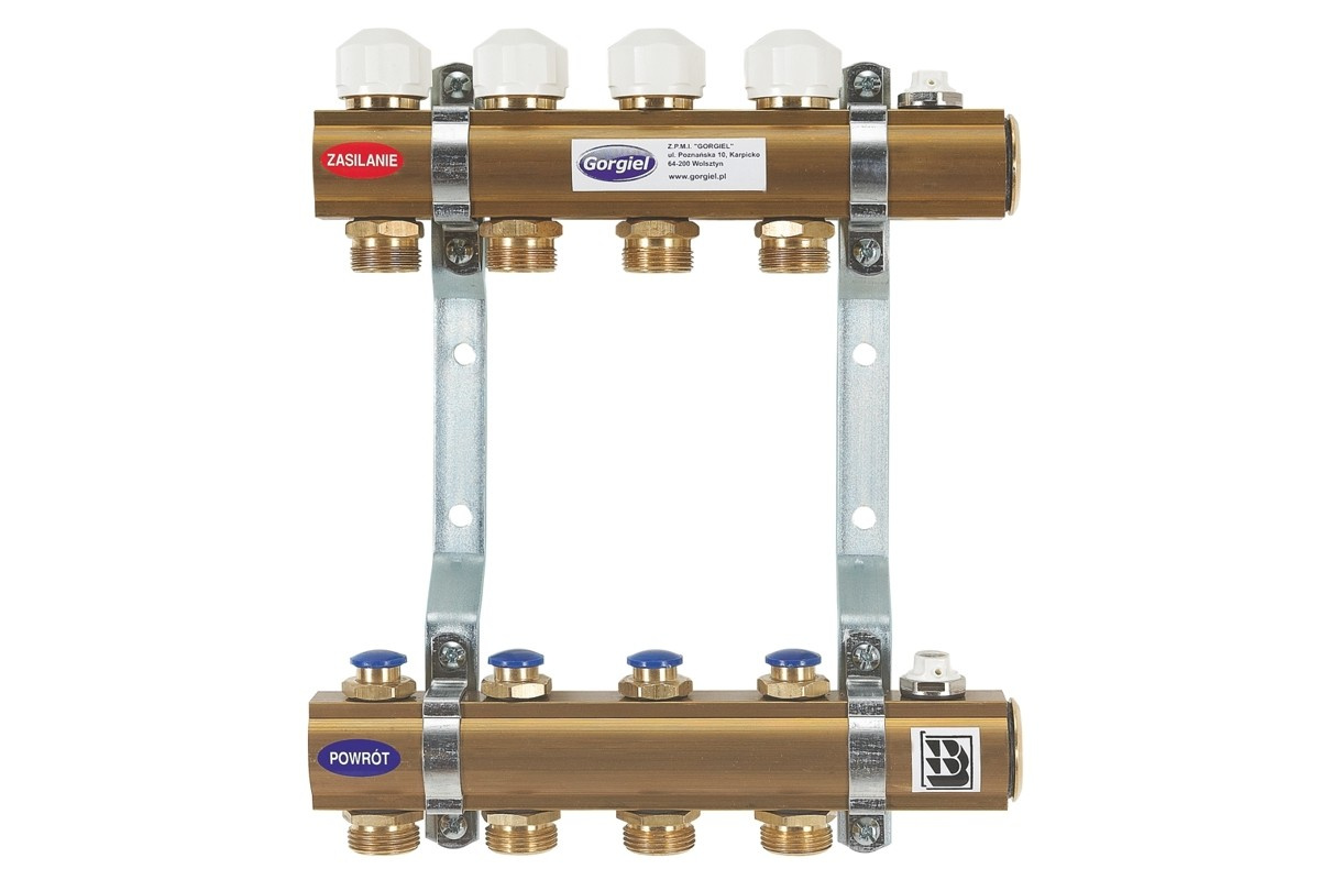belka mosiężna z gwintami 1/2" i 1", nypel redukcyjny 1/2" x 3/4" i korek 1" z uszczelnieniem O-ring, wkładka zaworu termostatycznego gwint M30 x 1,5, zawory regulacyjne, odpowietrznik ręczny 1/2", zawieszenia