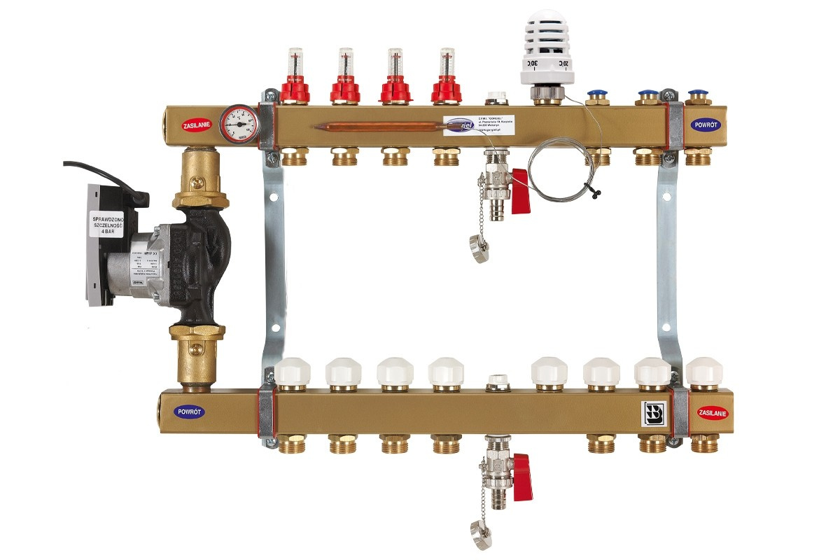 belka stalowa z gwintami 1/2" i 1", nypel redukcyjny 1/2" x 3/4" i korek 1" z uszczelnieniem O-ring, przepływomierz, wkładka zaworu termostatycznego gwint M30 x 1,5, odpowietrznik ręczny 1/2", zawieszenia stalowe cynkowane, pompa Wilo, zaowry kulowe odcinające pompę; termometr na belce zasilającej układ podłogowy, zawór zasilający 3/4", zawór powrotny 3/4"; kulowe zawory spustowe 1/2", głowica termostatyczna z czujnikiem kontaktowym