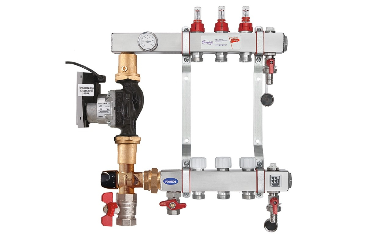 Belka ze stali nierdzewnej z gwintami 1/2" i 1", nypel redukcyjny 1/2" x 3/4", korek mosiężny 1" z uszczelnieniem O-ring, przepływomierz, wkładka zaworu termostatycznego gwint M30 x 1,5, odpowietrznik ręczny 1/2", zawieszenia stalowe cynkowane, energooszczędna pompa Wilo, zawory kulowe odcinające pompę; termometr na belce zasialjącej ukałd podłogowy, zawór zasilający 1", zawór powrotny 1/2";zawór mieszający trójdrożny przedział temperatur 20-45oC; kulowe zawory spustowe 1/2"